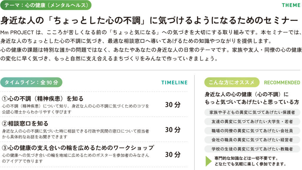 本セミナーでは、身近な人のちょっとした心の不調に気づき、最適な相談窓口へ導いてあげるための知識やつながりを提供します。心の健康の課題は特別な誰かの問題ではなく、あなたやあなたの身近な人の日常のテーマです。家族や友人・同僚の心の健康の変化に早く気づき、もっと自然に支え合えるまちづくりをみんなで作っていきましょう。