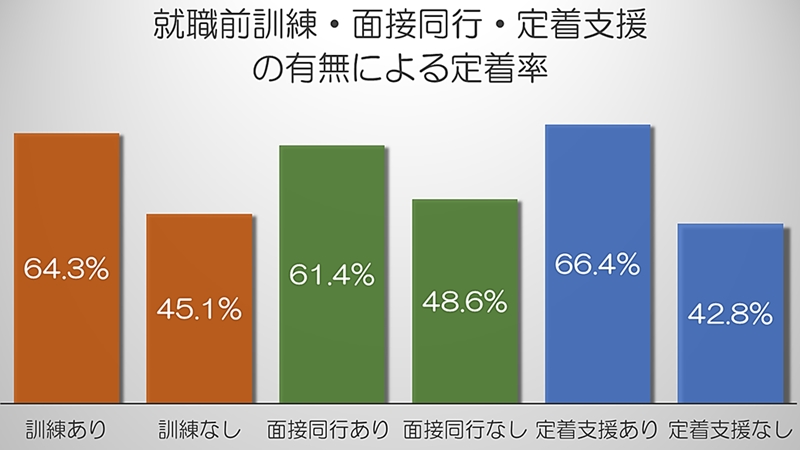 先ほどご紹介した「障害者の就業状況等に関する調査研究」では、「就職前訓練」、「面接同行」、「定着支援の有無」による定着率データもあります。