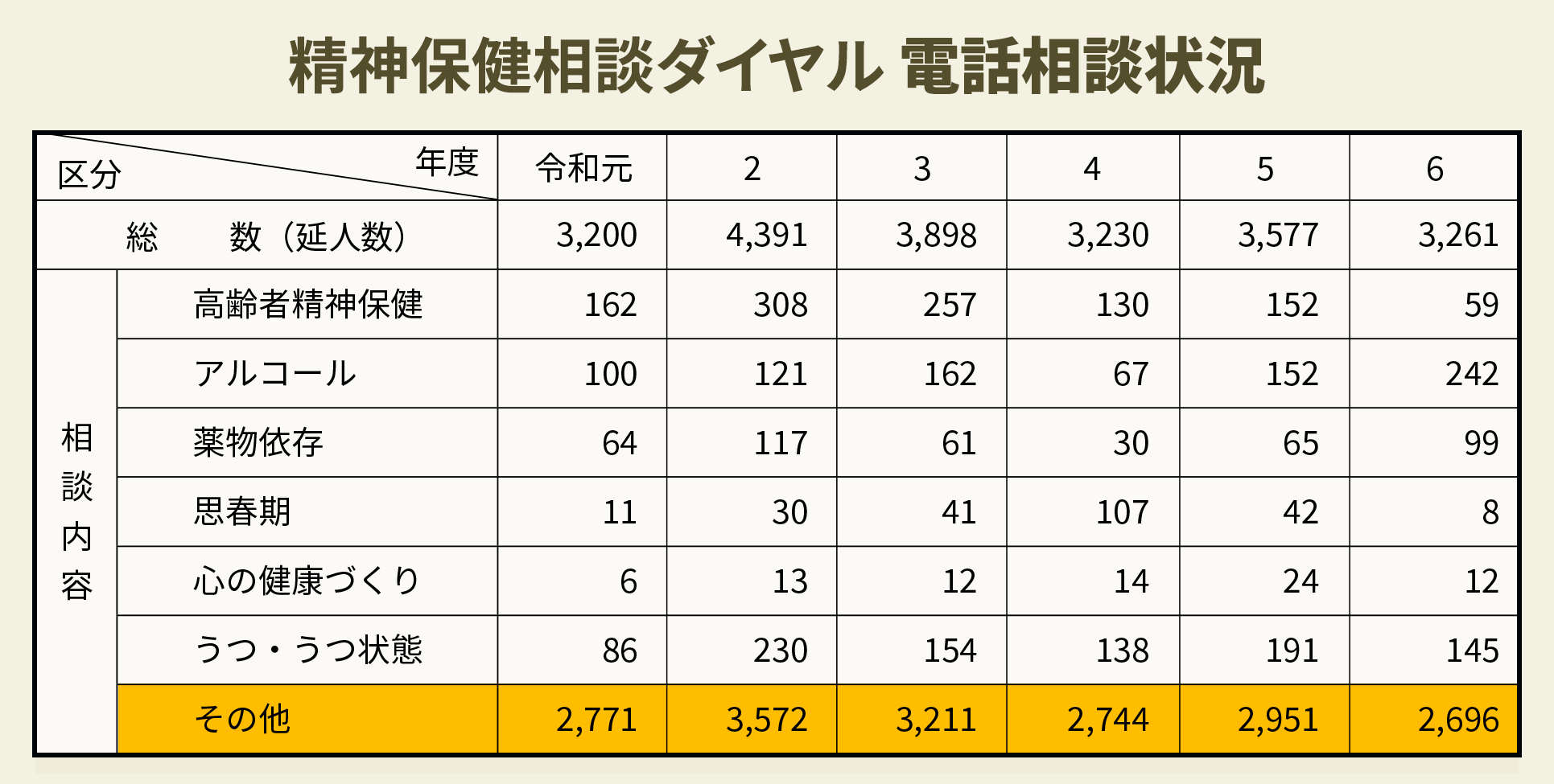 「相談件数は年ごとに変動しますが、電話相談は年間3,000件を超えることもあります。うつや依存症、高齢者の認知症に関する相談が多く、思春期の心の不調を抱えるご家族からの問い合わせも少なくありません。匿名の相談も多いですが、『話せてよかった』という言葉をいただくたびに、つながる意味を実感します。」