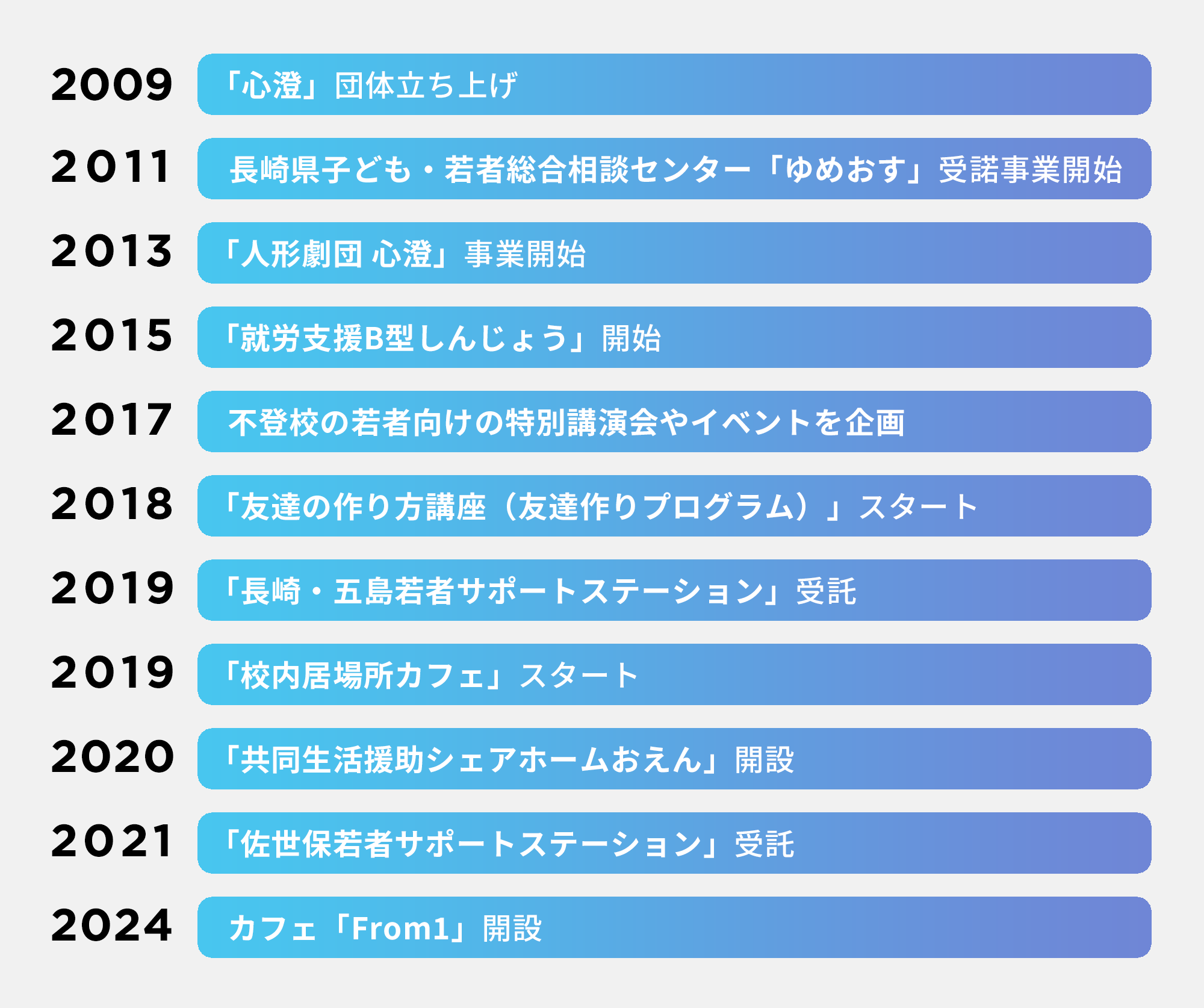 社会に出てからは、孤独や不安を抱える人が身近に多くいる現実を知り「誰もが安心して話せる場が必要だ」と強く感じるようになります。その思いが2009年の心澄(しんじょう)設立につながり、訪問支援を皮切りに、相談窓口「ゆめおす」、不登校予防の取り組み、人形劇団しんじょう、日常を取り戻すB型しんじょう、居住支援のおえん、そしてカフェFrom1へと活動は広がっていきます。