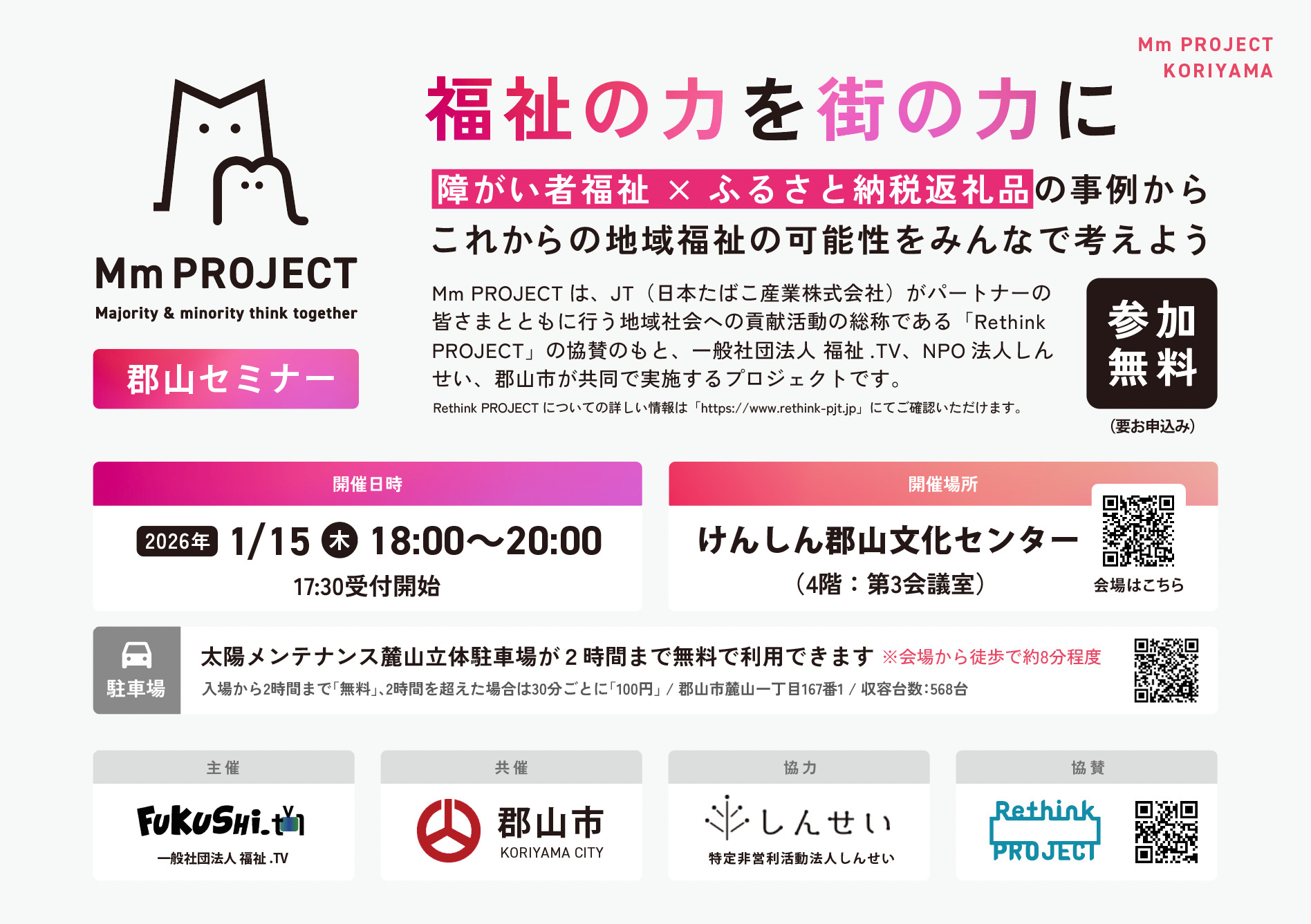 Mm PROJECT は、JT(日本たばこ産業株式会社)がパートナーの皆さまとともに行う地域社会への貢献活動の総称である「Rethink PROJECT」の協賛のもと、一般社団法人 福祉.TV、NPO法人しんせい、郡山市が共同で実施するプロジェクトです。Rethink PROJECTについての詳しい情報は「https://www.rethink-pjt.jp」にてご確認いただけます。