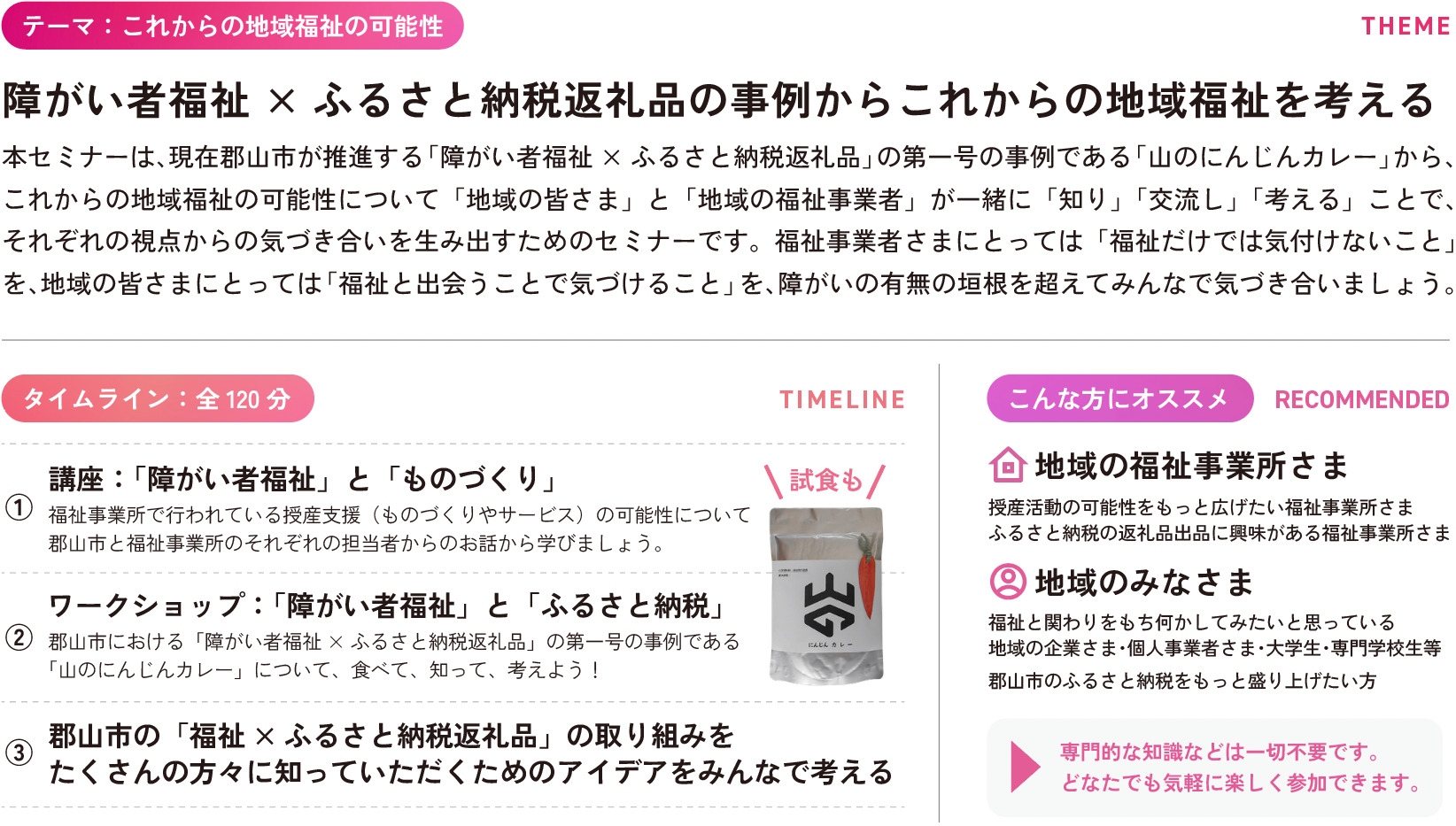 本セミナーは、現在郡山市が推進する「障がい者福祉 × ふるさと納税返礼品」の第一号の事例である「山のにんじんカレー」から、これからの地域福祉の可能性について「地域の皆さま」と「地域の福祉事業者」が一緒に「知り」「交流し」「考える」ことで、それぞれの視点からの気づき合いを生み出すためのセミナーです。福祉事業者さまにとっては「福祉だけでは気付けないこと」を、地域の皆さまにとっては「福祉と出会うことで気づけること」を、障がいの有無の垣根を超えてみんなで気づき合いましょう。