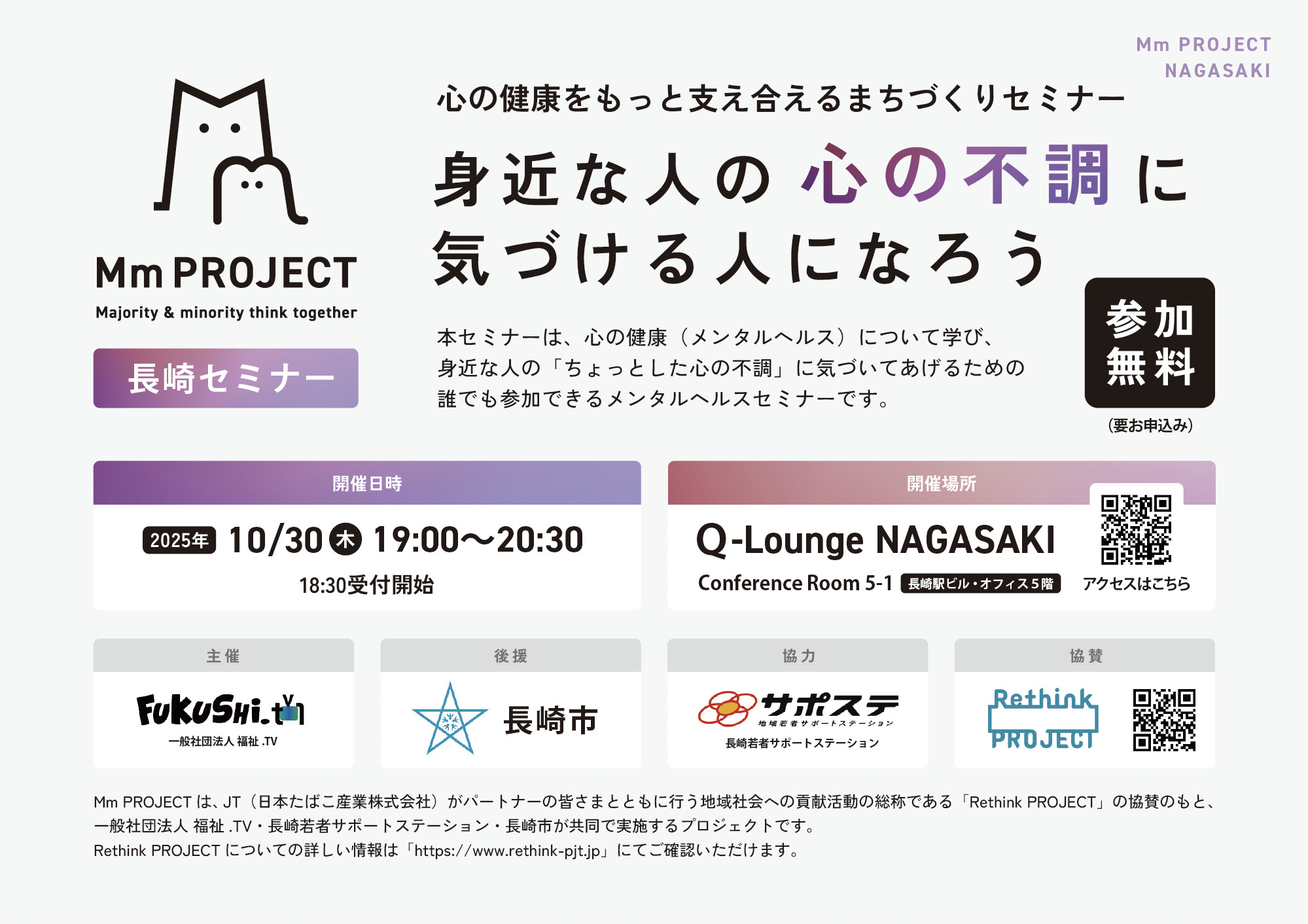 Mm PROJECT は、JT(日本たばこ産業株式会社)がパートナーの皆さまとともに行う地域社会への貢献活動の総称である「Rethink PROJECT」の協賛のもと、一般社団法人 福祉.TV・長崎若者サポートステーション・長崎市が共同で実施するプロジェクトです。Rethink PROJECTについての詳しい情報は「https://www.rethink-pjt.jp」にてご確認いただけます。