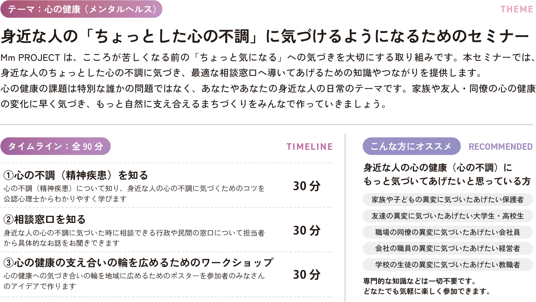 本セミナーでは、身近な人のちょっとした心の不調に気づき、最適な相談窓口へ導いてあげるための知識やつながりを提供します。心の健康の課題は特別な誰かの問題ではなく、あなたやあなたの身近な人の日常のテーマです。家族や友人・同僚の心の健康の変化に早く気づき、もっと自然に支え合えるまちづくりをみんなで作っていきましょう。